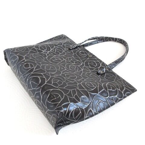 〇ローズ調の型押しが施されたカチッとハリのあるレザーです。