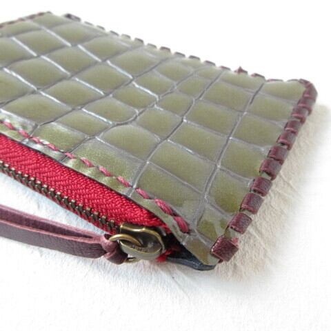 〇メタリックグリーンのエナメルクロコの鱗目が淡いパープルになっていて