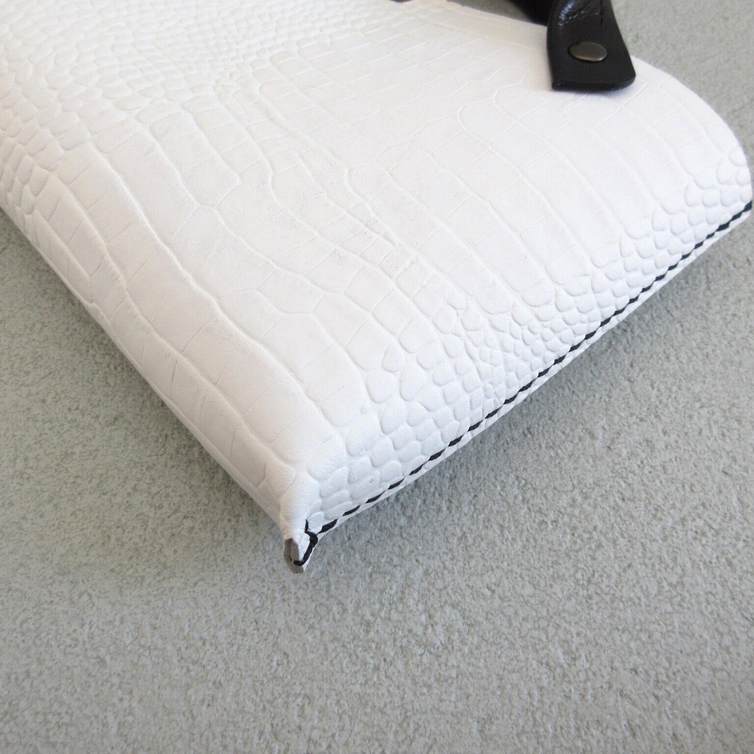 ☆ホワイトの型押しクロコにブルーブラックのハンドルとグレーのステッチでソフトなアクセントを付けました(^^/
